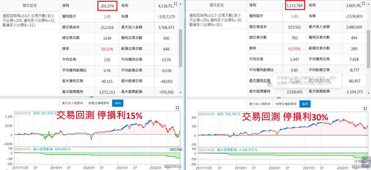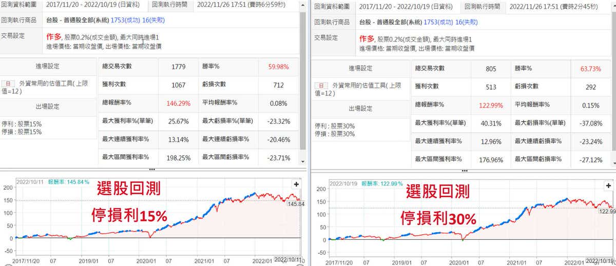 由於這個估值方式,可能是外資拿來判斷股票價格是否合理的方式,而以外資的操作方式,停損利不太可能就只是僅僅7%,應該會是更高的停損利甚至持有時間更長,而這邊將停損利調整為15%、30%來做比較