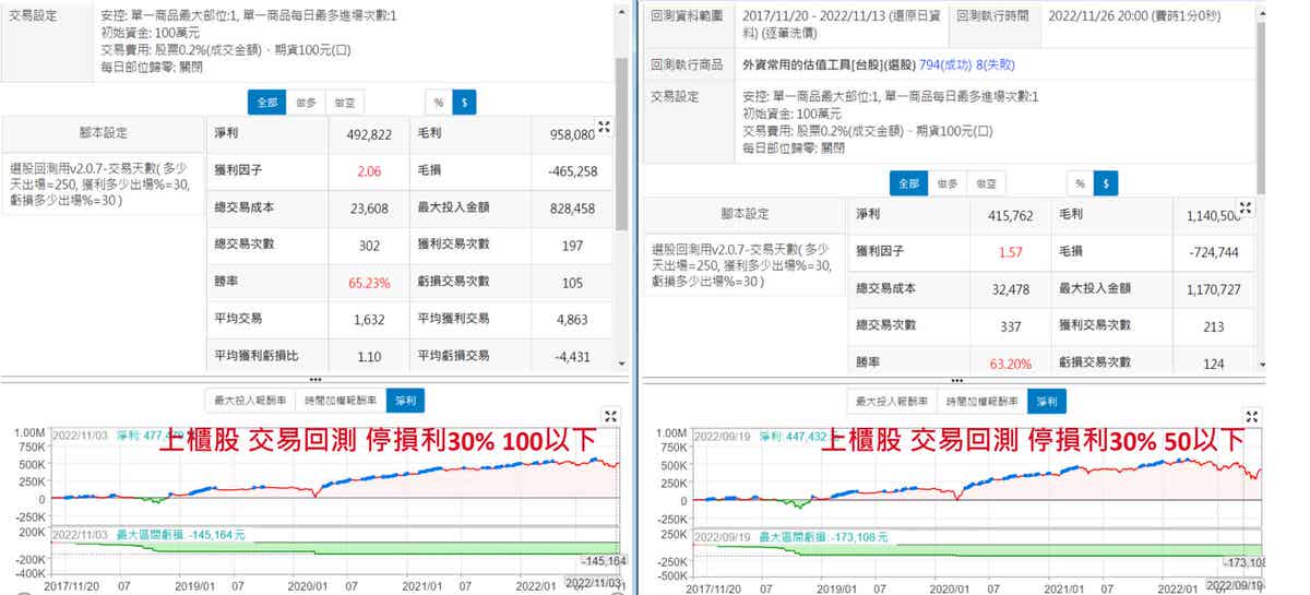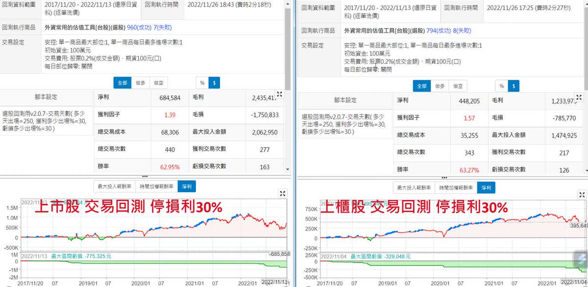 同樣採用停損利30%,但將上市櫃股票分開回測,上櫃股票的表現看來是比較穩定的