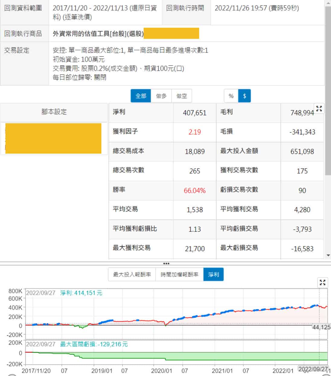 這個外資評估外資評估股票價值的方式,XQ Facebook僅提供了估值的計算公式,並沒有提供出場方式建議與回測結果,我們只能先根據XQ過往的回測方式,暫定7%停損利為我們的預設值。